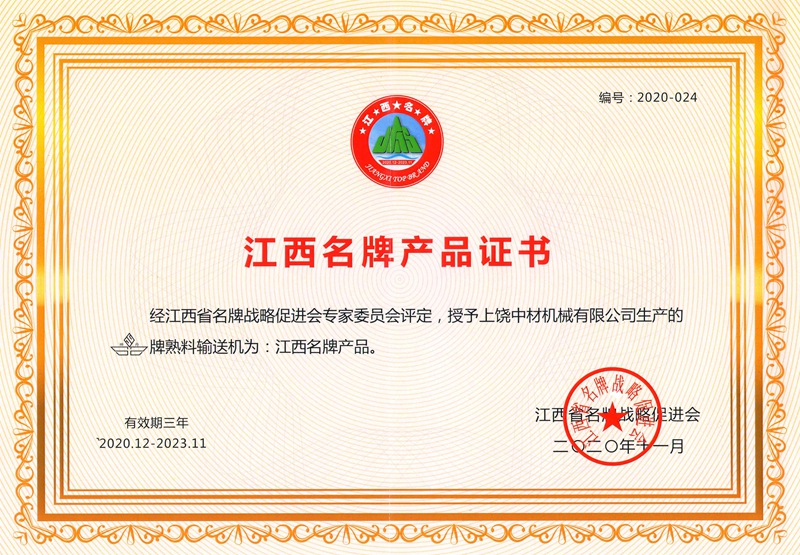 上(shàng)饒中材(cái)“神舟”牌(pai)熟料輸(shū)送機獲(huo)評江西(xī)名牌産(chǎn)品👨❤️👨